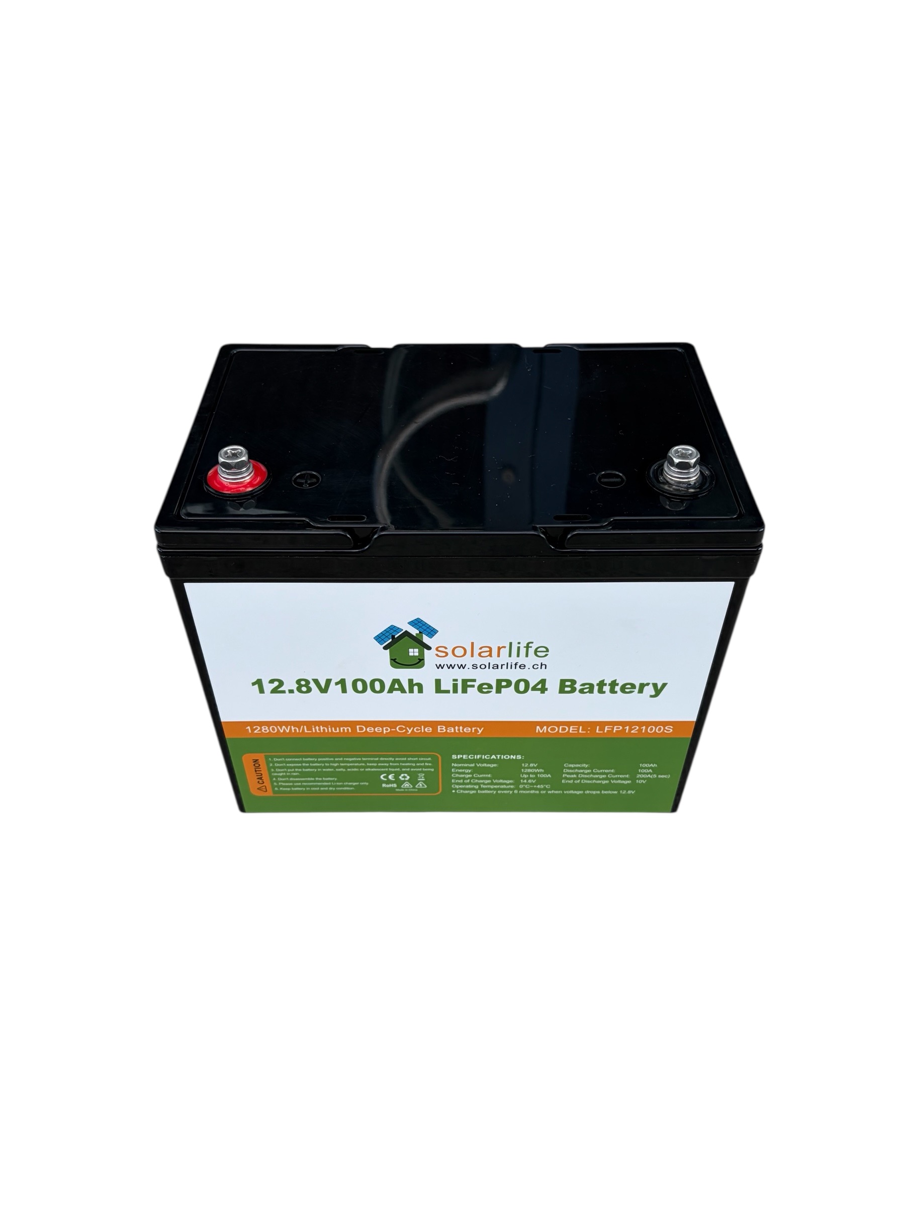 Solarbatterien, Lithium Batterie LiFePO4 12V 100Ah mit 2000W Spitze sind auf maximale Zyklenzahl und Lebensdauer ausgelegt. Die Batterien können zu 80 % entladen werden. Eine Lithium Batterie LiFePO4 12.8V 100Ah 2500W versorgt problemlos einen Ventilator, einen Fernseher, Kaffeemaschine, Beleuchtungen aller Art sowie Ladegeräte für Handy und E-Bike!